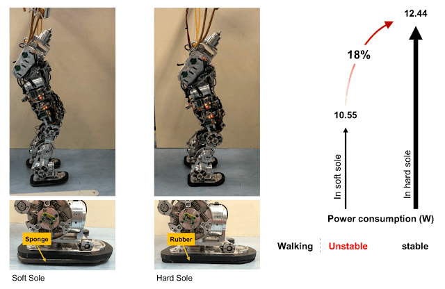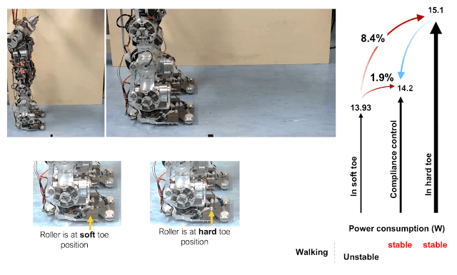 Additional experimental results were conducted with iCub legs to validate the improvement of the foot mechanism’s function, as well as power consumption during walking. The soft and stiff flat soles were compared using different materials. Comparing the trials, the power consumption was compared as the soft sole allowed for 18% less consumption than the stiff sole as shown in Figure 3. The walking performance was unstable and couldn’t maintain a straight gait with the soft sole, while the stiff sole allowed for stable walking. The variable compliant feet with soft/stiff toe configuration exhibited similar behavior to the soft/stiff sole material experiments. Among the different stiff configurations, the difference in power consumption was 8.4%. This is presumably due to the weight of the foot mechanism. By combining the advantages of the stiff sole, which provides stable walking balance, and the soft sole, which offers lower power consumption, a stable and energy-efficient walking pattern is achieved as shown in Figure 4 and the video clip.